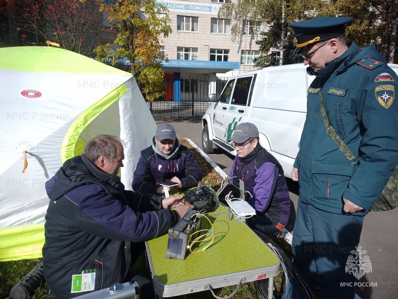 В Главном управлении МЧС России по Костромской области по вводной были отработаны вопросы по восстановлению канала связи с привлечением аварийно-восстановительных бригад операторов связи. Для доведения экстренной информации в местах массового пребывания людей был задействован мобильный комплекс информирования и оповещения населения (МКИОН).