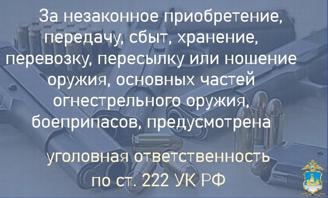 Приём у граждан незаконно хранящегося оружия осуществляется в дежурной части территориального органа МВД России.