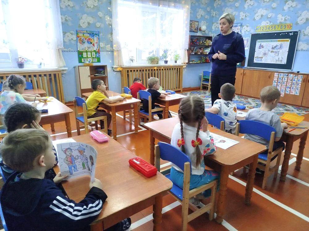 Рассматривая иллюстрации с зимними развлечениями, под руководством инспектора дети проанализировали опасные ситуации, которые могут возникнуть во время прогулки и игр на свежем воздухе.Внимание детей было обращено на сугробы вблизи проезжей части, которые закрывают видимость водителю и пешеходам, а так же на недопустимость игры рядом с дорогой.