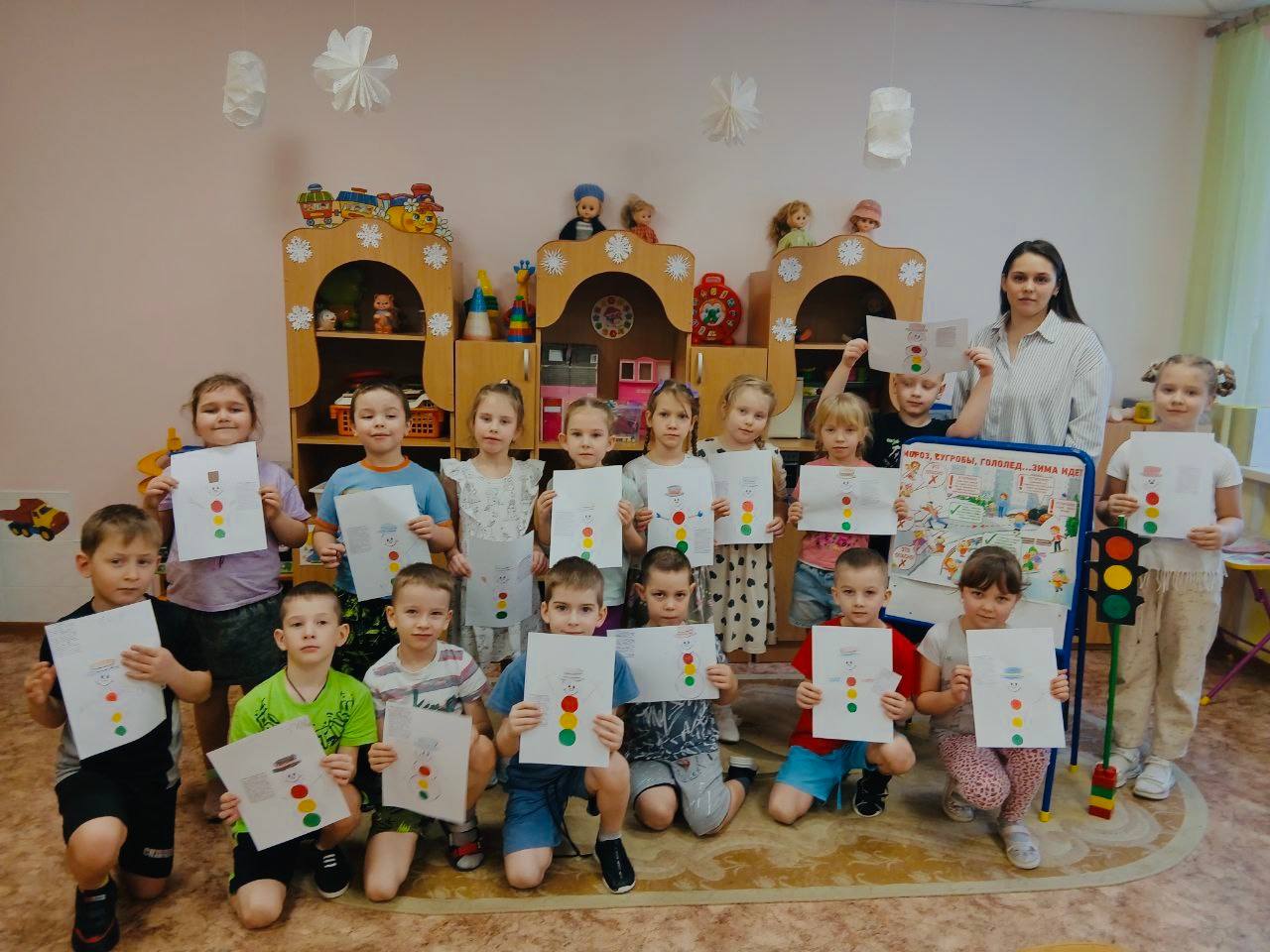 В ходе занятия детьми совместно с воспитателями и автополицейскими была создана памятка в виде: "Снеговика - светофора"