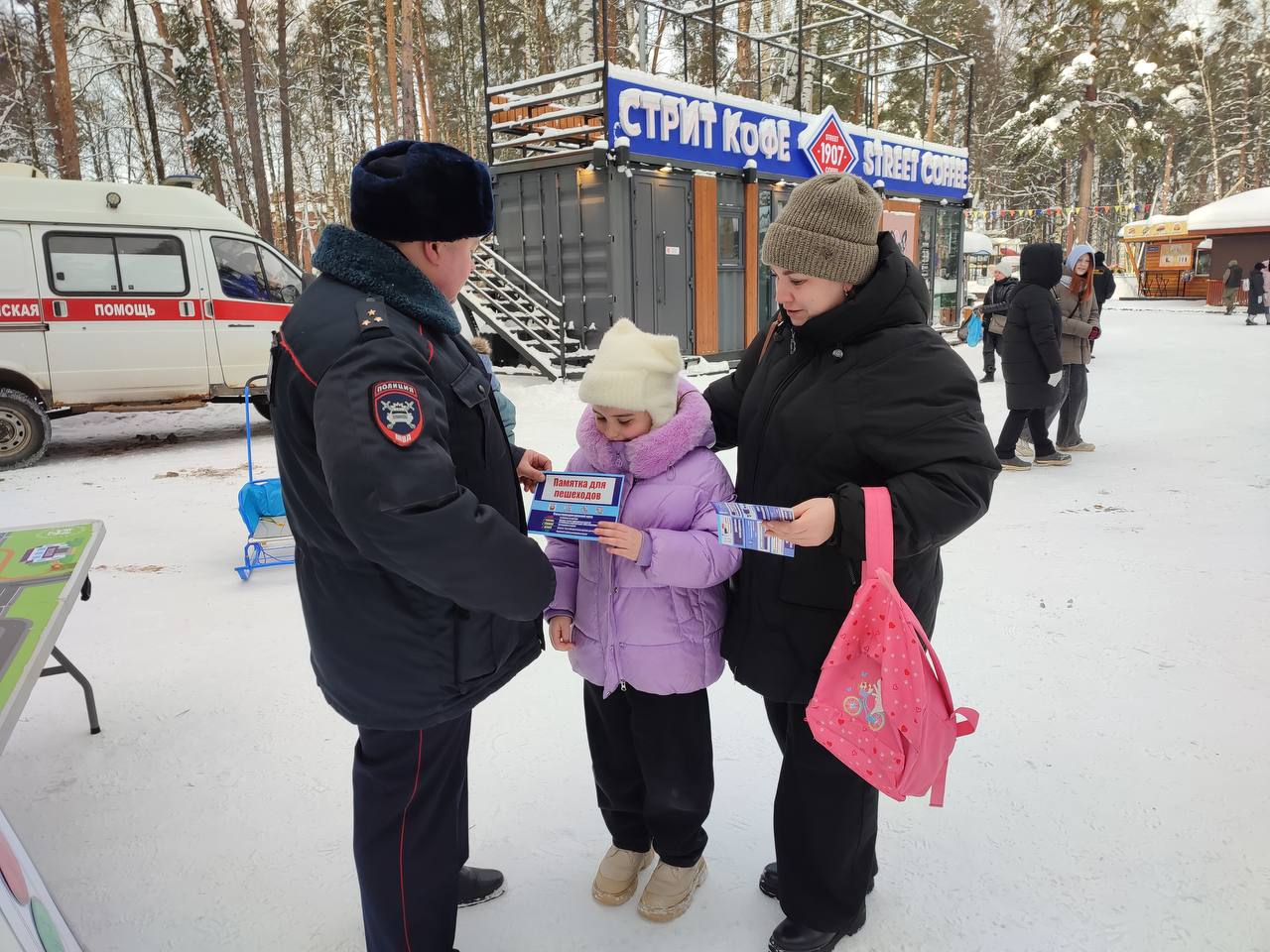 В парке «Берендеевка» стражи порядка и педагоги призвали детей и взрослых быть внимательными на дороге, избегать опасных ситуаций и размещать на одежде световозвращающие элементы.