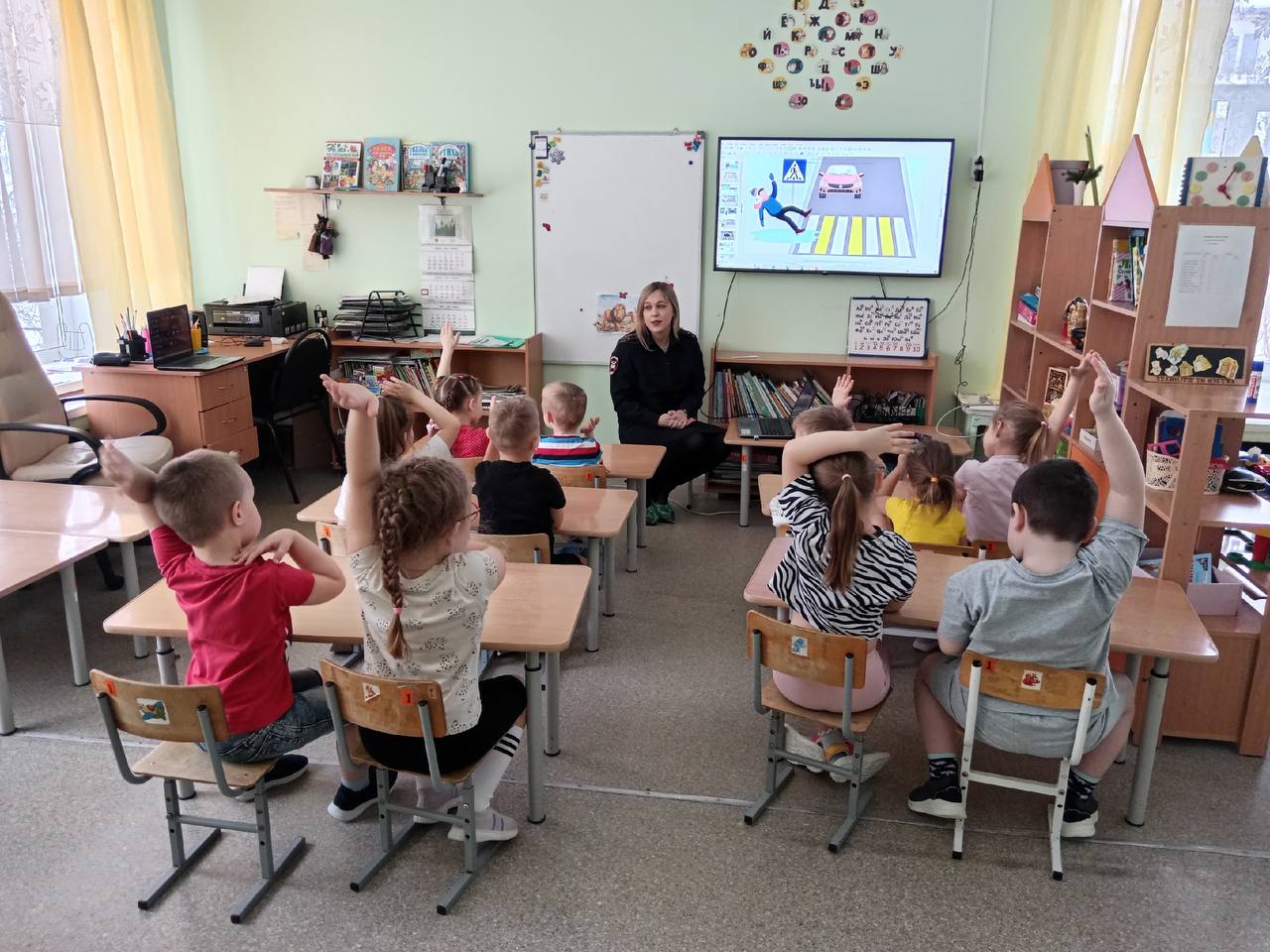 В автоинспекторы провели занятие для дошкольников из детского сада «Семицветик». Детям рассказали о правилах перехода проезжей части зимой, а также о правиле поднятой руки: оно помогает водителям понять, что пешеход собирается переходить дорогу, а изза невысокого роста ребёнок с поднятой рукой становится заметнее.