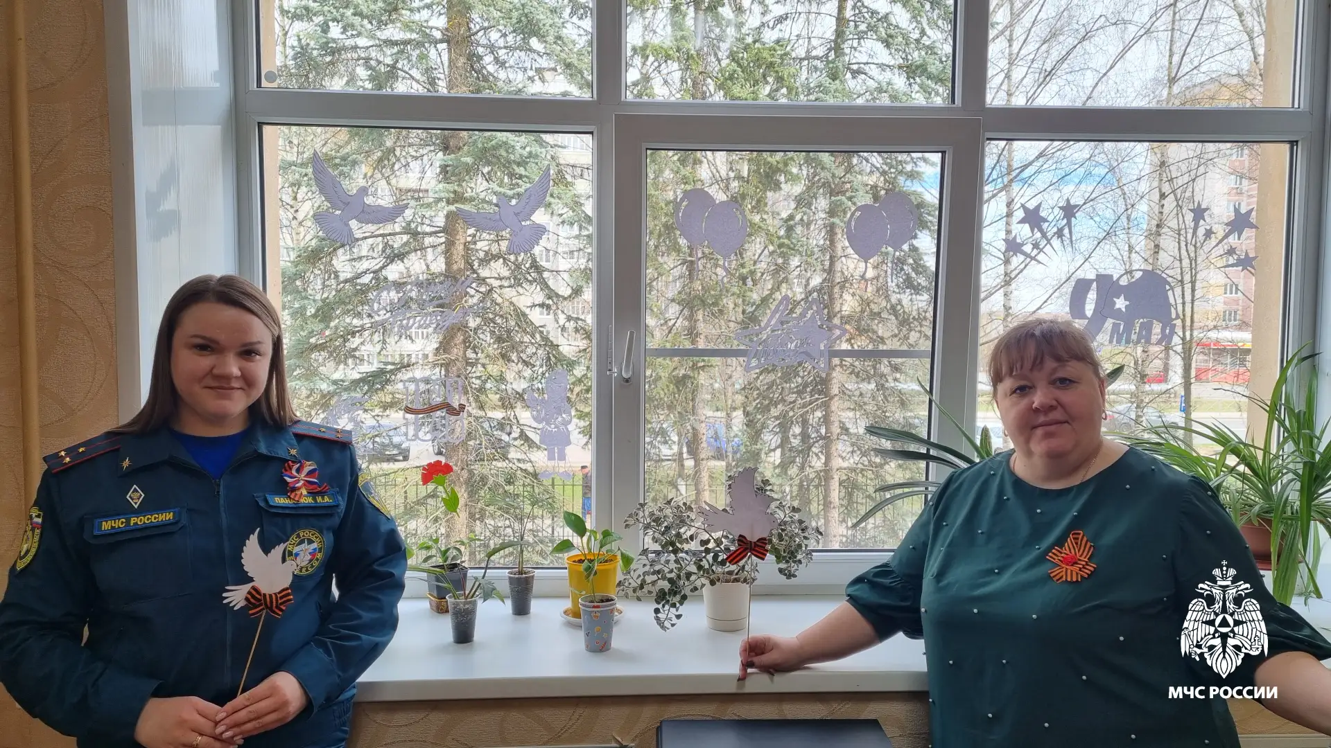 Сотрудники чрезвычайного ведомства разместили на окнах силуэты голубей, журавлей и Вечного Огня в знак памяти о погибших на фронтах войны.