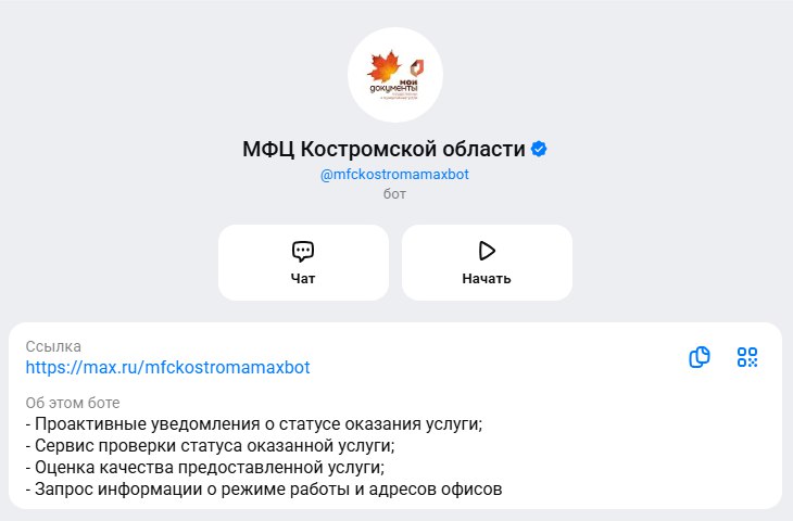 2.Добавьте бота, используя название «МФЦ Костромской области» либо прямую ссылку - @mfckostromamaxbot