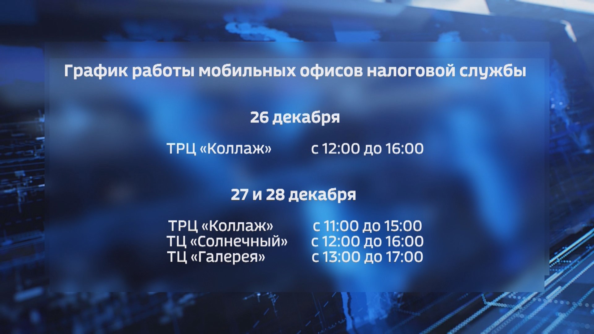 Сегодня офис налоговой будет работать в ТРЦ «Коллаж». В субботу и в воскресенье горожан примут в торговых центрах «Солнечный», «Галерея» и «Коллаж».
