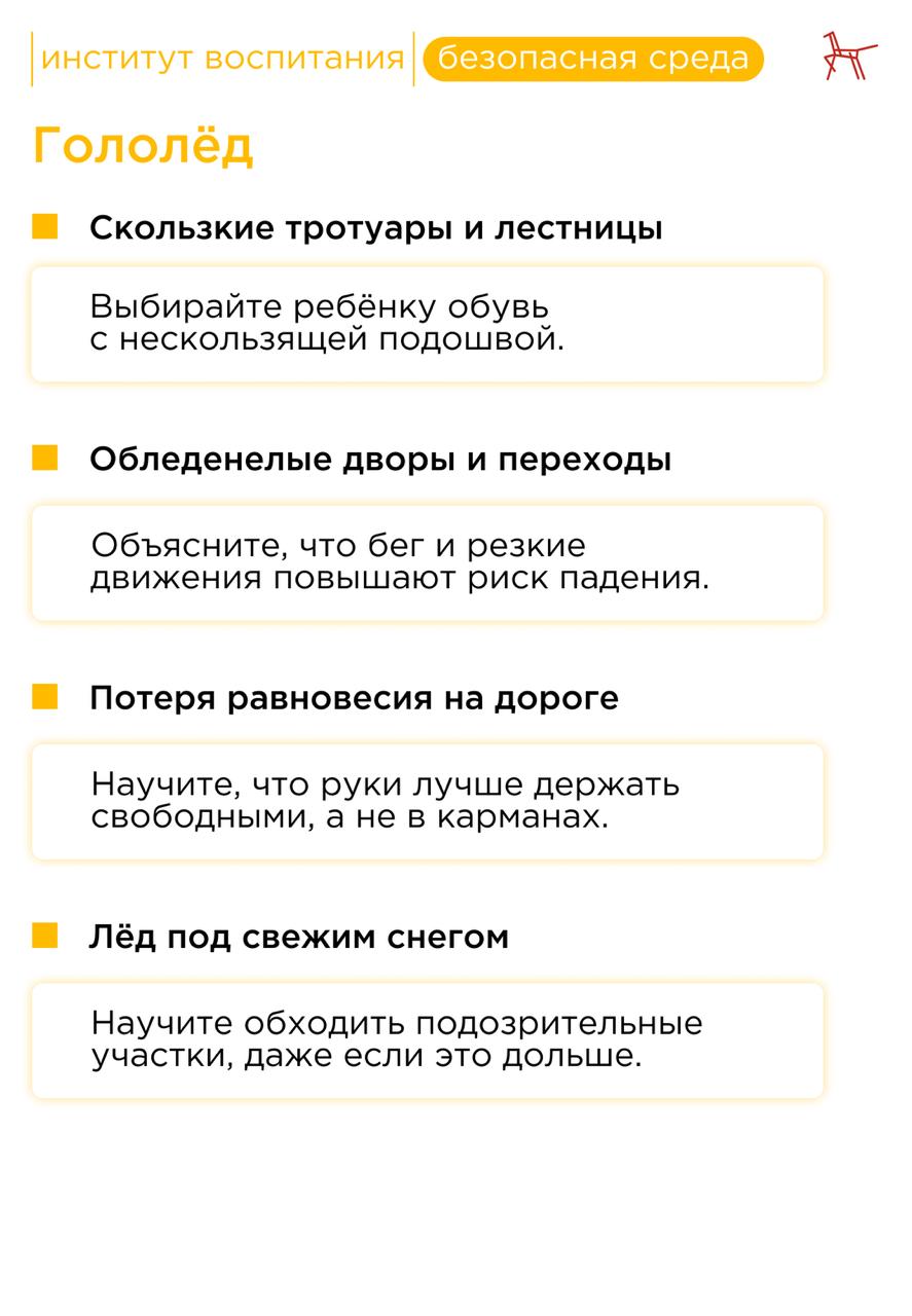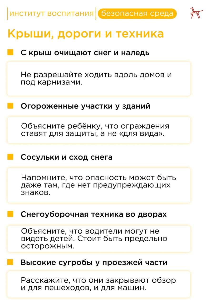 Зимой риск травм увеличивается не только из-за гололёда, но и из-за скрытых под снегом предметов, плохой видимости и работы тяжёлой техники. Важно заранее обсудить с ребёнком правила безопасного поведения.