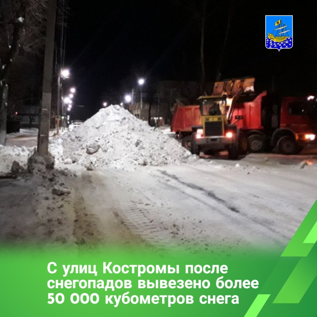 В ночь с 19 на 20 января силами подрядных организаций выполнялась расчистка остановок и переходов с вывозом снега на улицах Северной Правды, Байдарской, Октябрьской, Долгой Поляне и других. Также после уборки снег вывозился с моста через реку Кострому и территории Красных рядов.