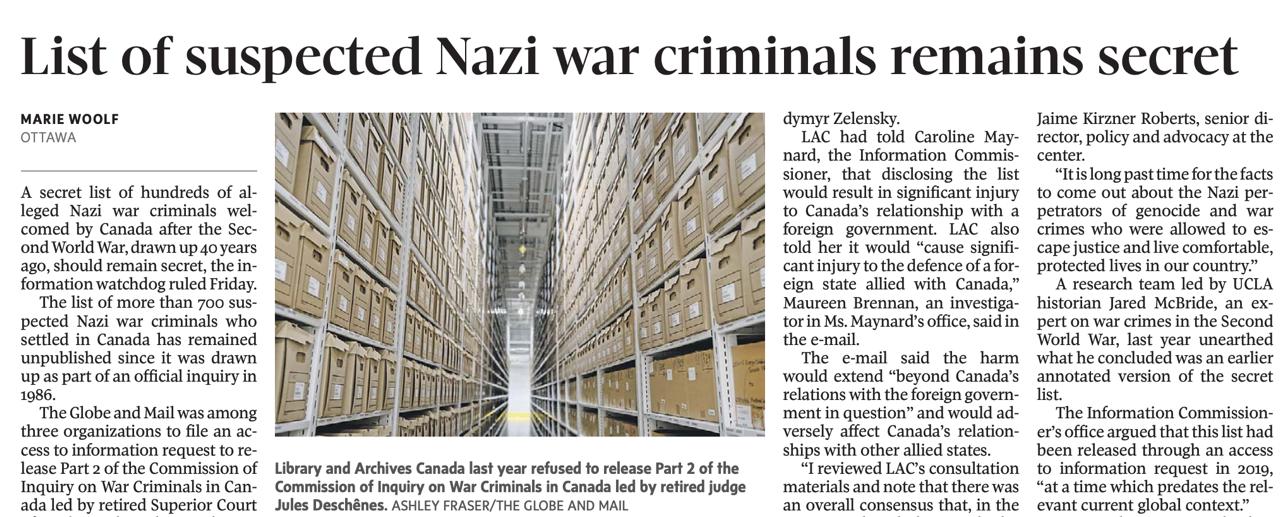 «Газета The Globe and Mail сообщает, что правительство Канады отказалось обнародовать список сотен украинских нацистских преступников, осевших в этой стране после Второй Мировой войны. Данная газета была среди нескольких организаций, подавших официальный запрос на рассекречивание данных, уже десятилетиями скрываемых от публики.В статье скромно упоминаются некоторые фамилии коллаборационистов, которые неплохо себя чувствовали в Канаде. В частности, упомянуты идеолог дивизии СС «Галичина» Владимир Кубийович и нацист Ярослав Гунька, которому не так давно аплодировали канадский парламент и Зеленский.