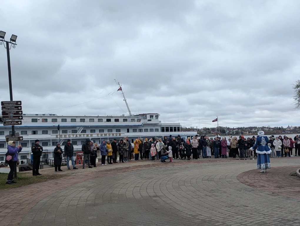Для гостей подготовили культурную программу с музыкальными номерами. На причале у беседки Островского пассажиров приветствовала Российская Снегурочка и ансамбль музыки, песни и танца «Волга-Волга».