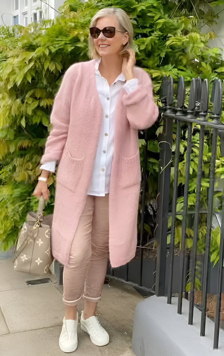 - Спокойные пастельные тона: Легкие бежевые брюки, слегка подвернутые, прекрасно смотрятся в сочетании с белой рубашкой и нежно-розовым трикотажным пуловером. Этот образ идеально дополнят стильные белые кроссовки для удобства в повседневной жизни.