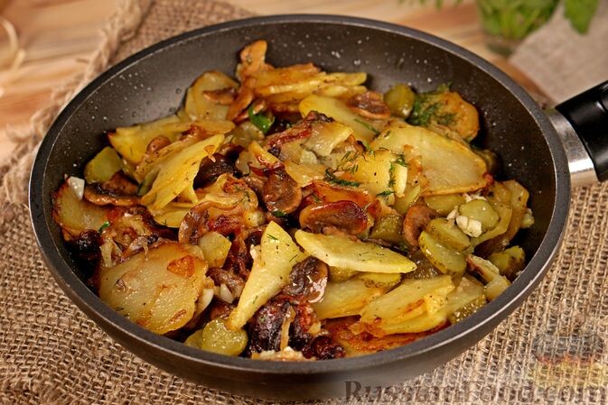 - Жареная картошка с грибами и маринованными огурцами – классика, которая никогда не устареет. Хрустящий картофель в сочетании с нежными грибами и пикантными огурцами станет настоящим открытием для ваших вкусовых рецепторов.