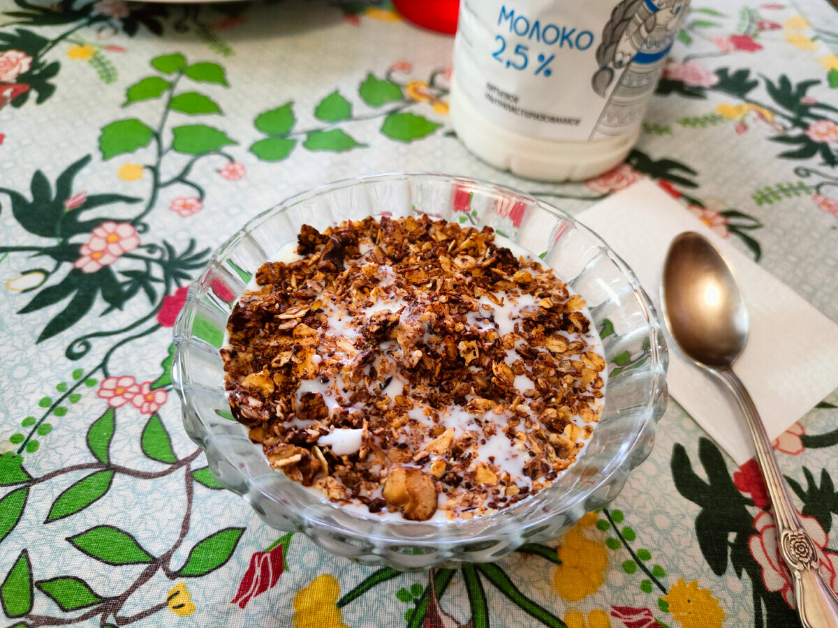 - Шоколадная гранола с молоком - идеальное начало дня.