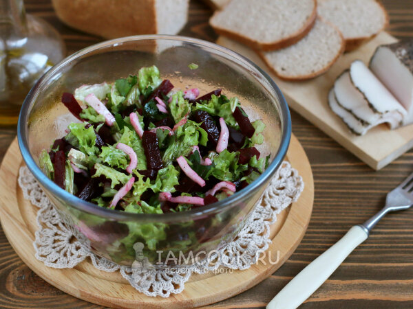 Этот салат сочетает в себе сладость свеклы и пикантность огурцов, создавая идеальный баланс. Полить майонезом — и готово!