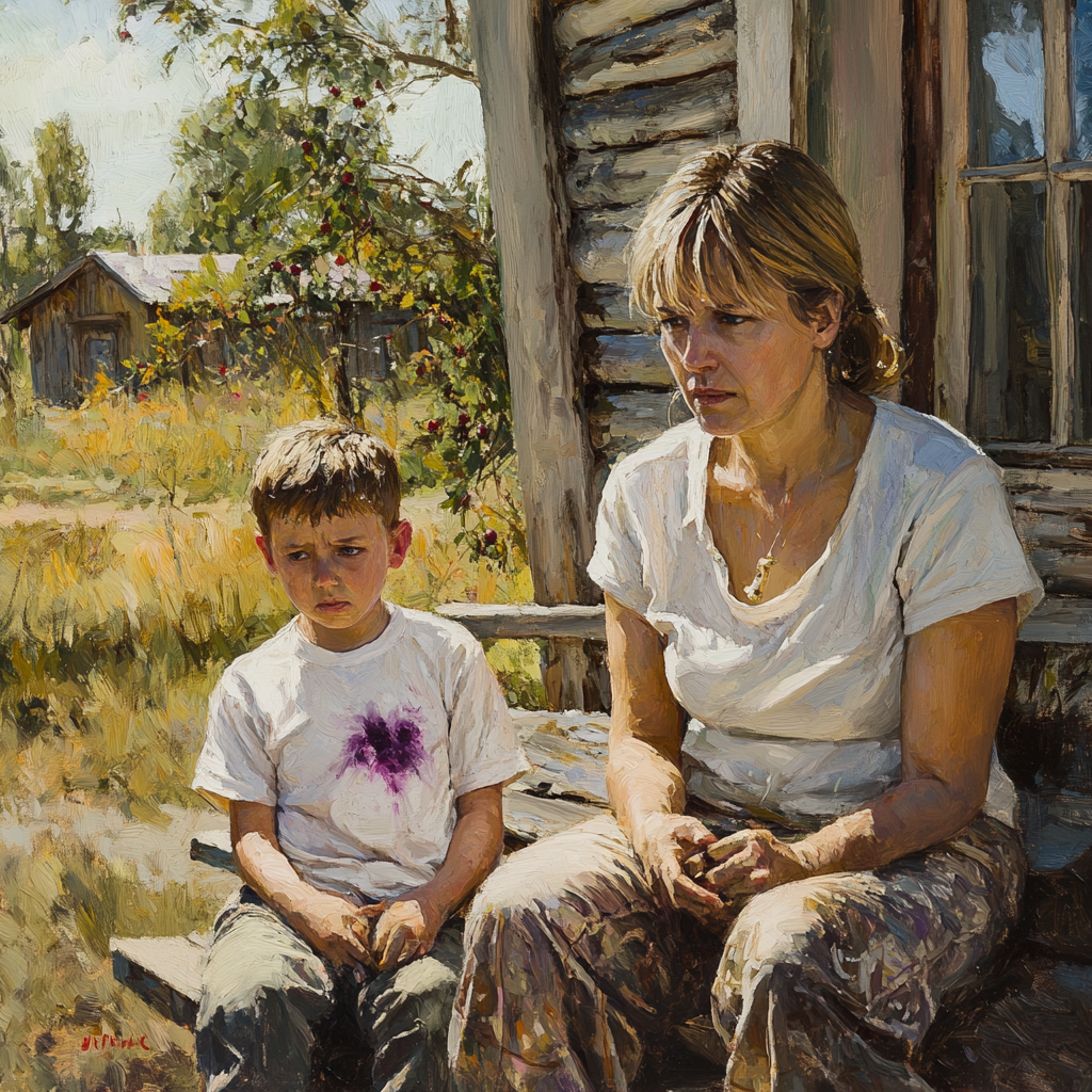 На маленькой дачной кухне Полина столкнулась с настоящей проблемой: футболка ее сына была испачкана фиолетовыми пятнами от смородины, ставшими результатом очередного шалости на ягодных кустах. В отчаянии, она решила обратиться к мужу Игорю, который был занят своими делами на улице.