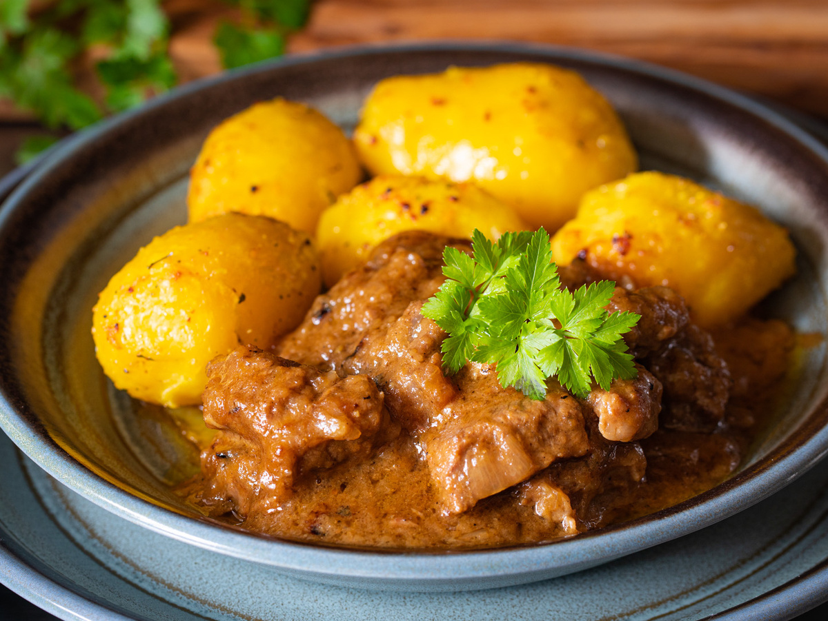 При приготовлении говядины основную роль играет сливочное масло. Им не следует экономить, ведь именно оно придаст блюду нужную текстуру и вкус. Достаточно лишь нескольких ингредиентов: мяса, лука, масла и соли. Воды добавлять не нужно – все необходимое будет в самом менте!