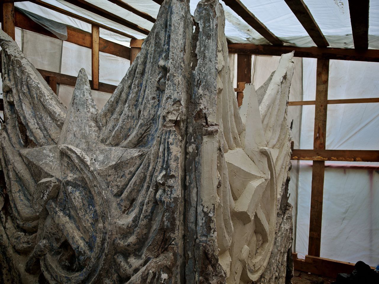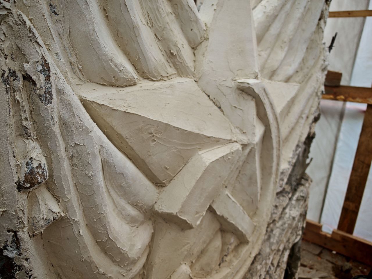 Основные реставрационные работы на объекте выполнены, теперь бригады занимаются отделкой. Рабочие штукатурят входную группу, чистят и красят металлические части конструкции. Рядом возведен "теплик", где специалисты восстанавливают рельеф и утраченные элементы двух декоративных «корон» с изображением серпа и молота. После восстановления в первоначальном виде их вернут на главные пилоны. Параллельно подрядчик приводит в порядок лестничный сход, готовит основание под укладку плитки.