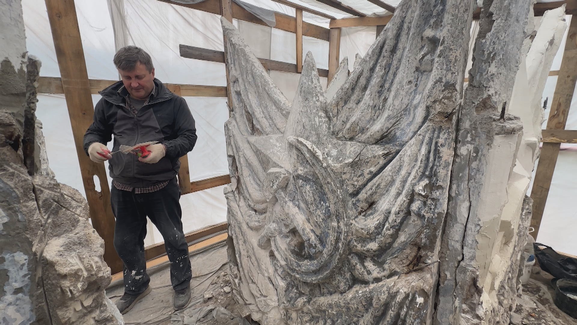 Работает подрядчик из Подмосковья. Рабочие закончили работы по укреплению фундамента, а также решили вопрос с водоотведением в пилонах. Чтобы сохранить конструкции сухими и предотвратить их разрушение, была проведена гидроизоляция и вентиляция. Сейчас бригады штукатурят входную группу, чистят и красят металлические части конструкции. Кроме того, специалисты восстанавливают рельеф и утраченные элементы двух декоративных «корон» с изображением серпа и молота. Их вернут на главные пилоны после окончания ремонта. Подрядчик также приводит в порядок лестничный сход и готовит основание под укладку плитки.