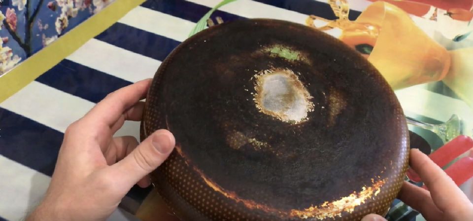 Уже на этом этапе многие загрязнения отходят просто от легкого прикосновения. Это позволяет почти полностью очистить посуду без применения агрессивных средств и с минимальными усилиями. После этого сковороду просто достают и подвергают дополнительной легкой обработке в раковине, чтобы достичь идеальной чистоты.