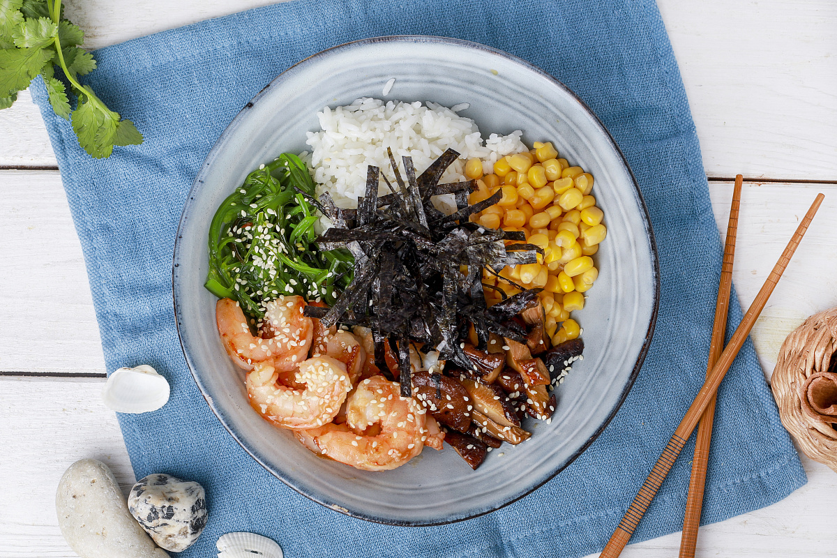 Шаг 4: Лист нори нарезается длинными полосками. В миске для подачи укладывается рис, вокруг него по кругу располагаются кукуруза, грибы, креветки и салат чука. Посередине помещаются полоски нори, а всю композицию украшают кунжутом, перед подачей на стол.