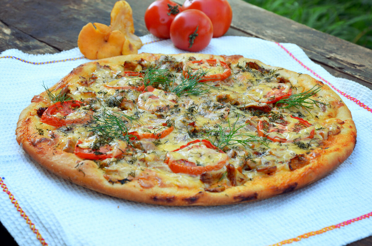 Для начинки идеально подойдут жареные лисички и свежие помидоры. Завершает процесс натирание сыра. Выпекать пиццу нужно в заранее разогретой духовке при температуре 180°C до румяной корочки.