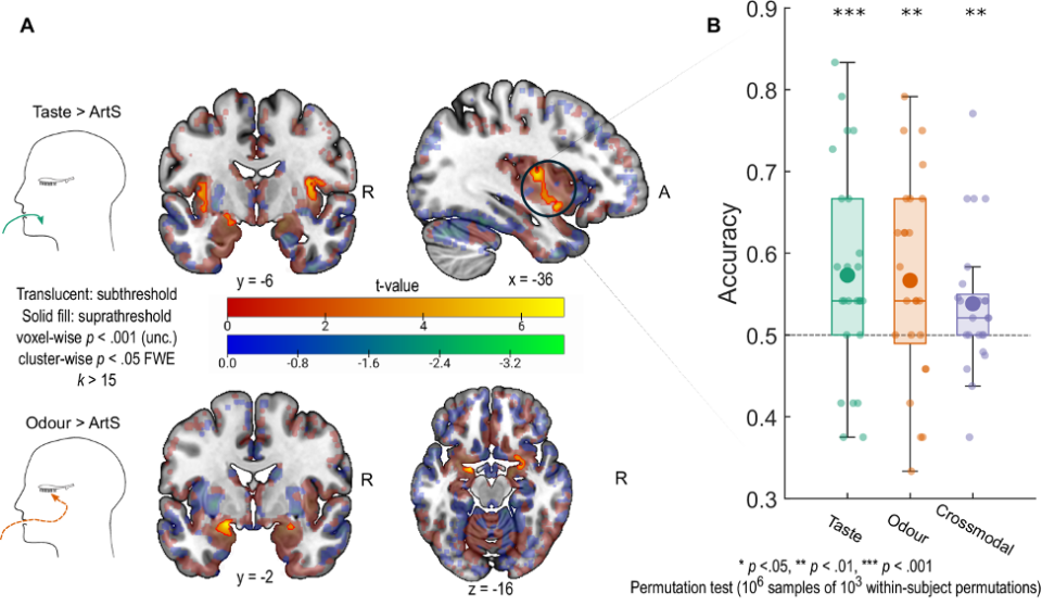 На двух последующих сессиях, проведенных с интервалом до 10 дней, участники испытали одномодальные стимулы — только вкусы или только запахи. Исследование включало использование функциональной МРТ для анализа нейронной активности в ответ на эти стимулы. Результаты показали, что островковая кора активно реагирует как на вкусы, так и на запахи, что доказывает наличие общего кода в нейронных паттернах.