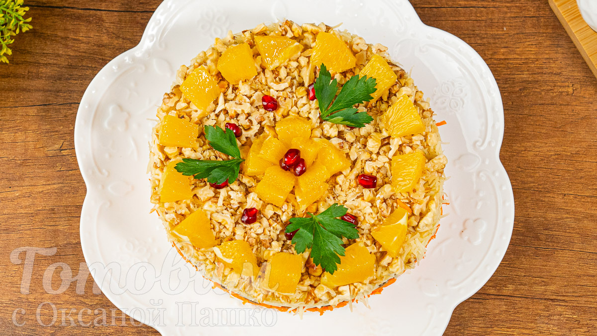 - Приготовление: Все ингредиенты нарезать, слоями уложить и, по желанию, украсить дольками апельсина и зернами граната для усиления визуального эффекта.