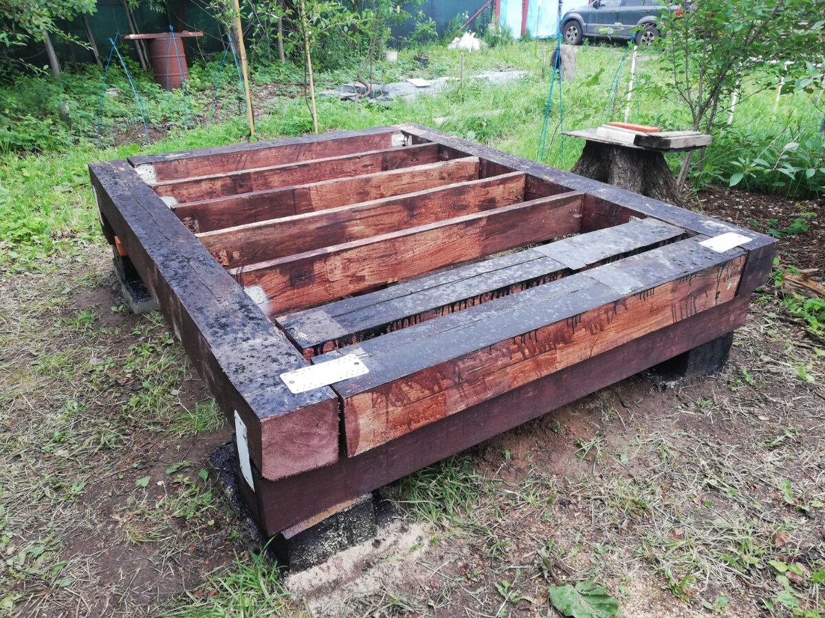 Заливка пескобетона помогла получить надежные основания, а затем дополнительно укрепленные кирпичные столбы были обработаны битумным праймером для защиты от влаги и морозов. В центре конструкции был установлен якорь, чтобы предотвратить сдвиги. На столбы был установлен каркас из бруса, который обеспечивал устойчивость всей конструкции.