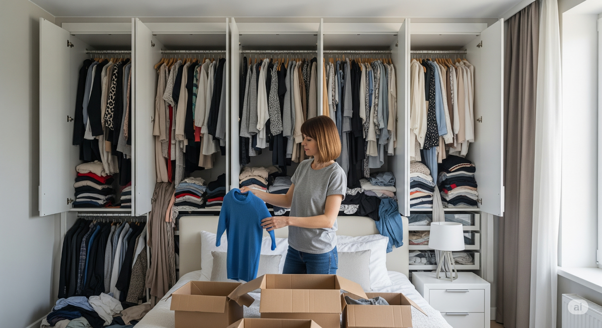 Первое действие — задать себе правильный вопрос. Какую атмосферу вы хотите создать? Представьте идеальный шкаф: вещи аккуратно висят, а между ними словно гуляет ветер. Чтобы всё прошло легче, подготовьте несколько коробок для сортировки вещей: "оставить", "передать", "можно оставить" и "выбросить". Можно подключить музыку или подкаст, чтобы сделать процесс менее рутинным.