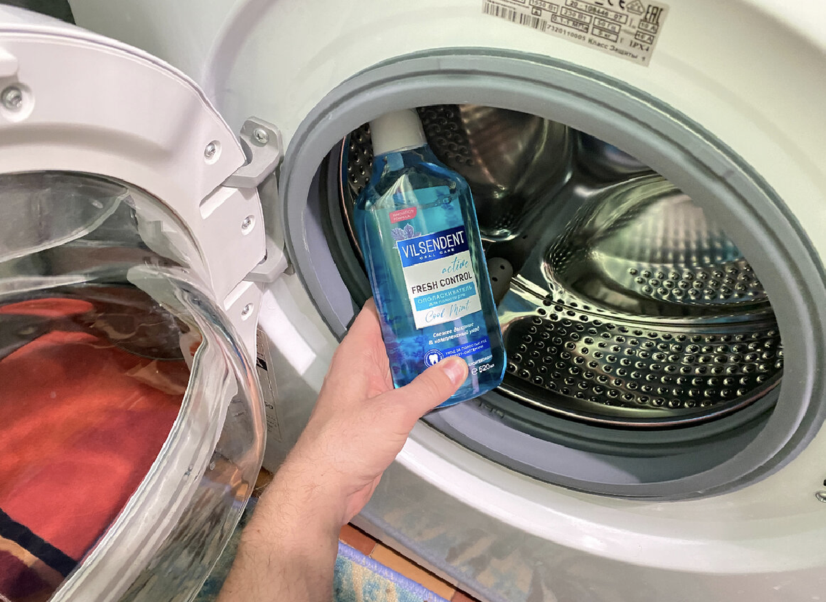 Ополаскиватель для рта стал отличным помощником для очистки стиральной машины. Сначала следует осмотреть уплотнительную резинку: обработка ополаскивателем поможет избавиться от грибков и бактерий, а также устранить неприятные запахи. При этом материал не пострадает.