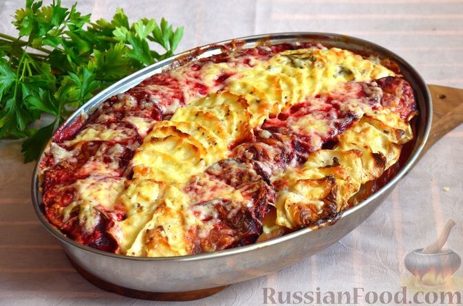 - Картофельный гратен со свеклой. Этот кулинарный шедевр восхищает сочетанием тонко нарезанных овощей, запечённых в сливках и приправленных пряностями. Каждый слой пронизан насыщенным вкусом, а сырная корочка добавляет блюду неповторимый шарм.