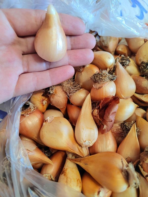 - Чистка и дезинфекция: Примерно через неделю после сушки необходимо удалить верхнюю шелуху и осторожно очистить поврежденные участки. Посреди каждой луковицы, как правило, появляются детки, которые нужно аккуратно извлечь и отделить для дальнейшего использования. Затем луковицы рекомендуется продезинфицировать, погрузив их в слабый раствор марганцовки на около 30 минут.