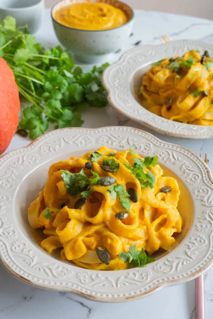 Далее, полученное пюре выложите в сковороду, влейте кокосовое молоко, бульон, добавьте специи и прогрейте на среднем огне, помешивая, около 5 минут. В это время отварите макароны до состояния аль денте и обжарьте тыквенные семечки в сухой сковороде. В завершение слейте макароны, смешайте их с соусом и разложите по тарелкам, украсив семечками и кинзой. По желанию, добавьте натертый сыр для более насыщенного вкуса.
