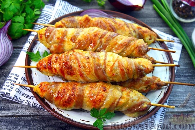 - Куриный кебаб в беконе на шпажках. Это великолепное блюдо станет отличной заменой привычному шашлыку. Свежие куриные филе превращаются в нежные кебабы, покрытые слоем хрустящего бекона и запеченные до золотистого цвета.