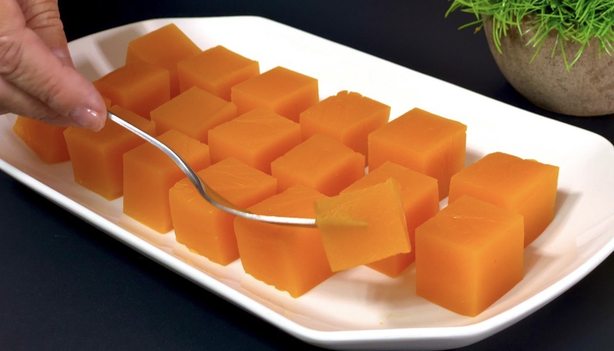 Подготовьте форму, застелив ее пленкой, и вылейте приготовленную массу. Уберите в холодильник на 6-8 часов, чтобы мармелад полностью застыл. После этого вытащите из формы, аккуратно нарезая на кубики. Они будут выглядеть эффектно и станут прекрасным дополнением к чаю.