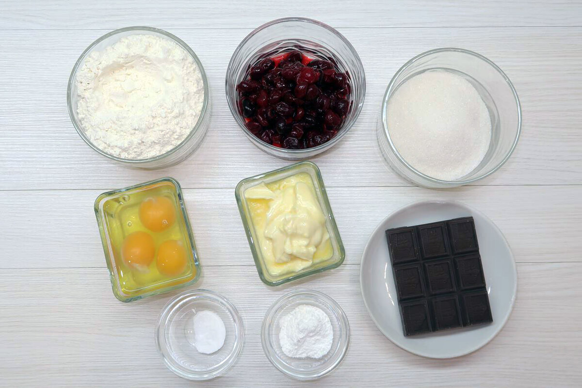 В глубокой миске взбивают масло с сахаром и ванилином до тех пор, пока сахар не растворится. Затем добавляются куриные яйца, и масса тщательно перемешивается. Далее в тесто вводят вишню и шоколад, после чего все аккуратно перемешивается.