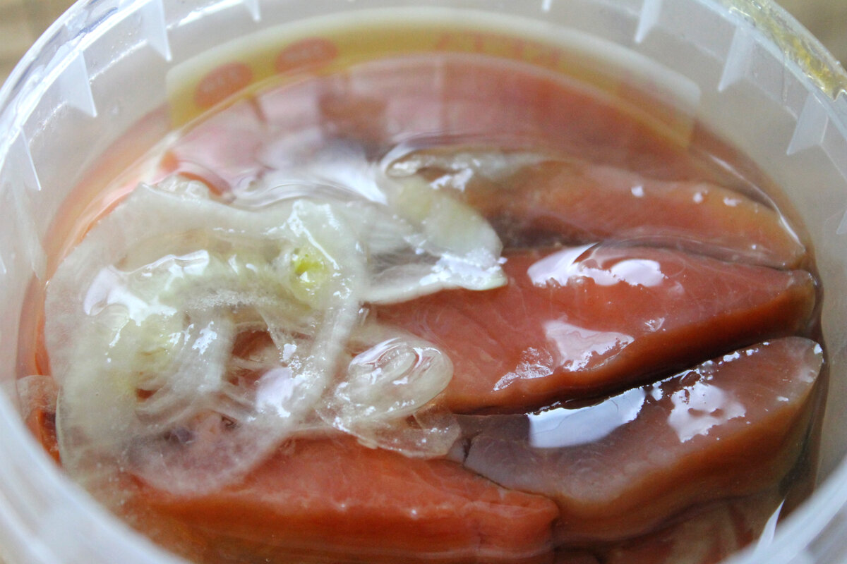 Кета, которую следует предварительно мелко порезать, добавляет насыщенности и делает закуску более сытной. Вся нарезка смешивается в одной миске, в процессе чего овощи выделяют соки, что делает добавление заправки необязательным. Масло, в котором была рыба, дополнительно улучшает вкус.