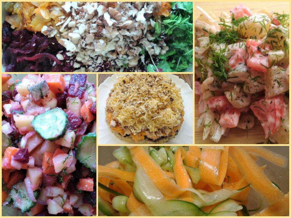 - Классический винегрет: Не зря этот салат стал любимым для многих. Просто отварите свеклу, картофель и морковь, затем смешайте с маринованными огурцами и луком. Заправьте растительным маслом, и ваш винегрет готов.