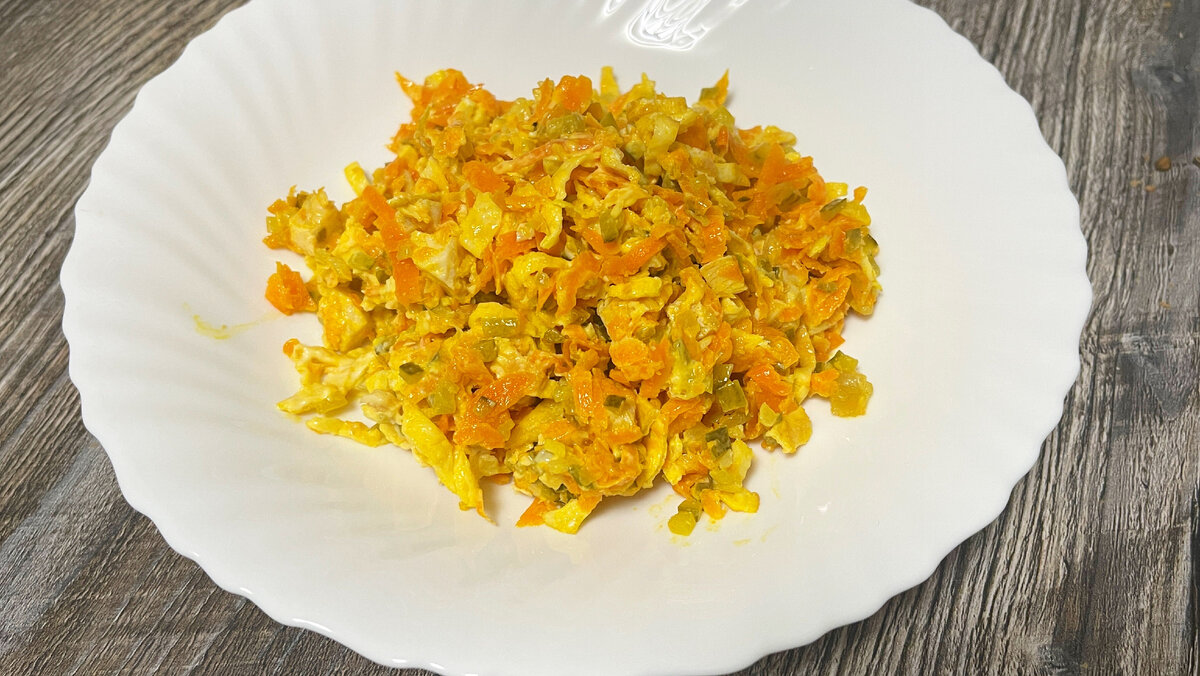 Приготовление яичных блинчиков. Два сырых яйца взбить, посолить, а затем обжарить на растительном масле, сформировав блинчики, которые затем нарезаются тонкой соломкой.