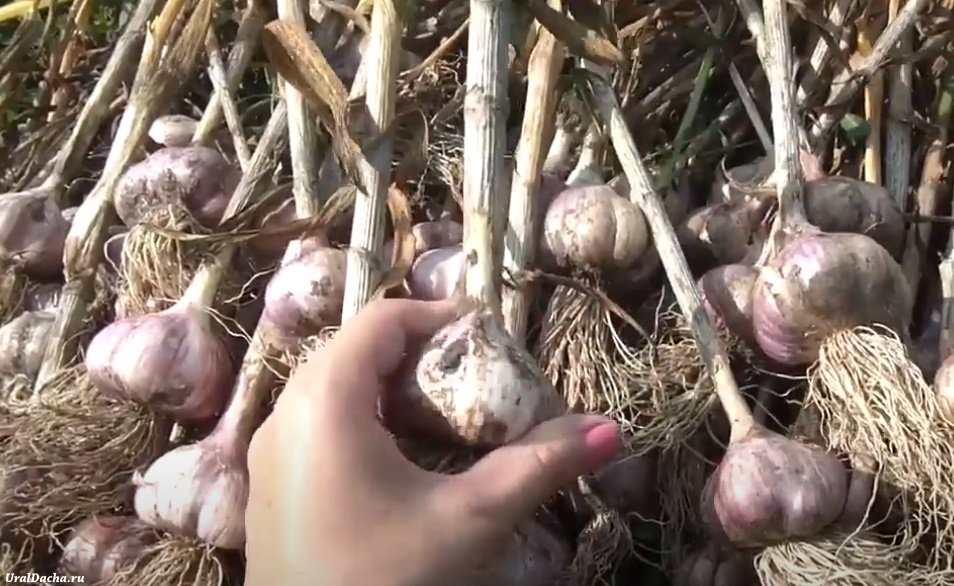 Другой, более надежный способ, заключается в оставлении на грядке 1-2 стрелок с семенами. Как только стрелка выпрямляется и семенные коробочки начинают раскрываться, можно смело убирать чеснок с грядки. Это свидетельствует о том, что головки готовы к сушке и дальнейшему хранению.