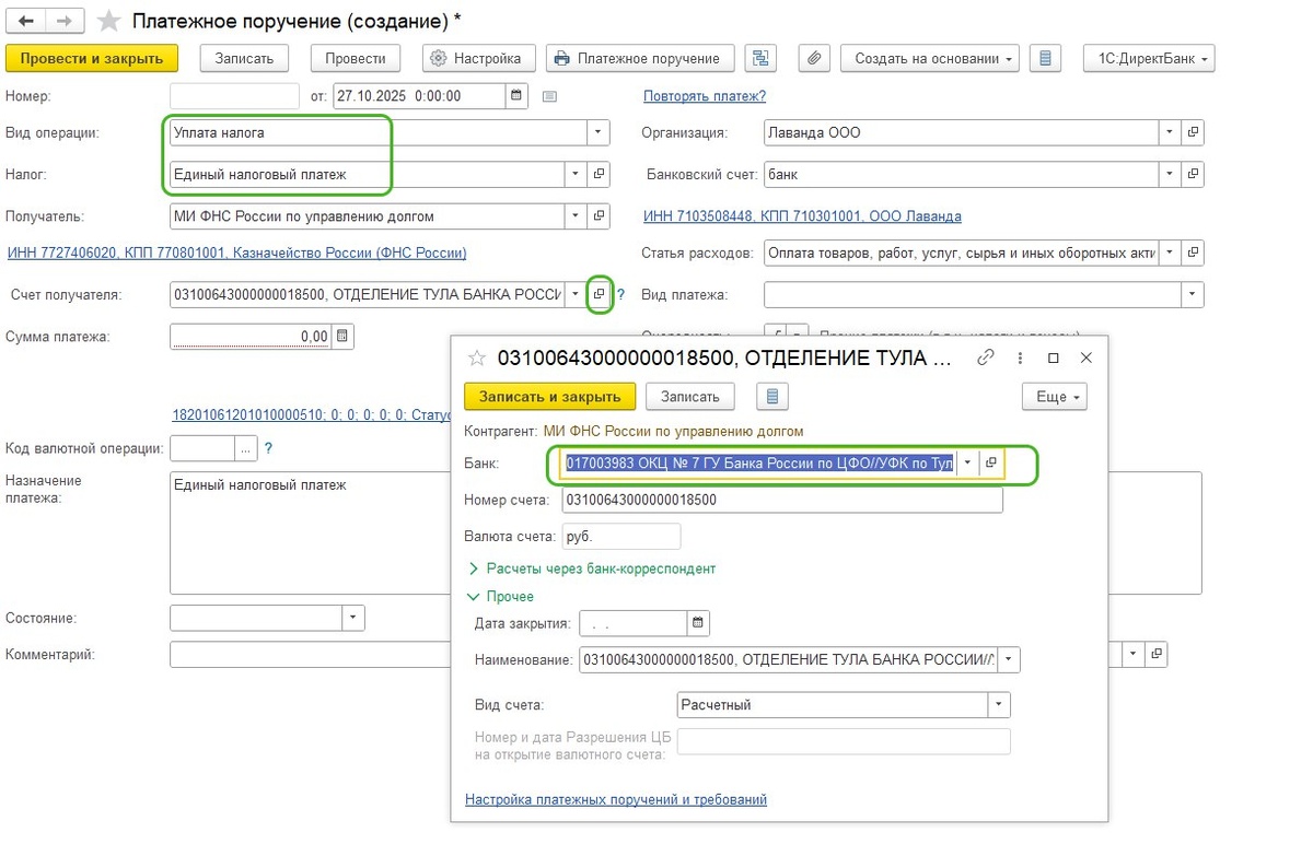 Для пользователей 1С Бухгалтерии важно учесть, что в системе нужно обновить информацию о банке получателя. При создании платежного документа по уплате налогов необходимо: