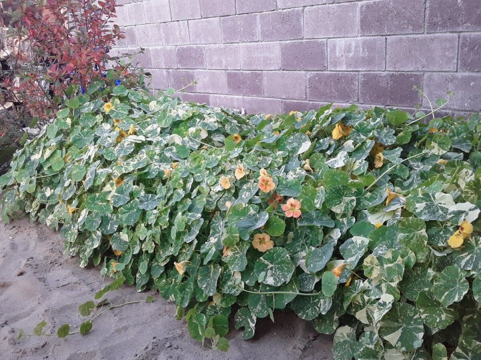 Настурция, известная как "Аляска", не только укрыла землю, но и добавила эстетический элемент в саду благодаря своим привлекательным мраморным листьям. Всего лишь семь семян, посаженных в разных местах, в итоге заполнили значительное пространство, превратив участок в роскошный портал зелени. Эта плетистая разновидность настурции даже открыла возможности для создания вертикального зеленого оформления, создавая симбиоз с растениями, которые уже росли рядом.