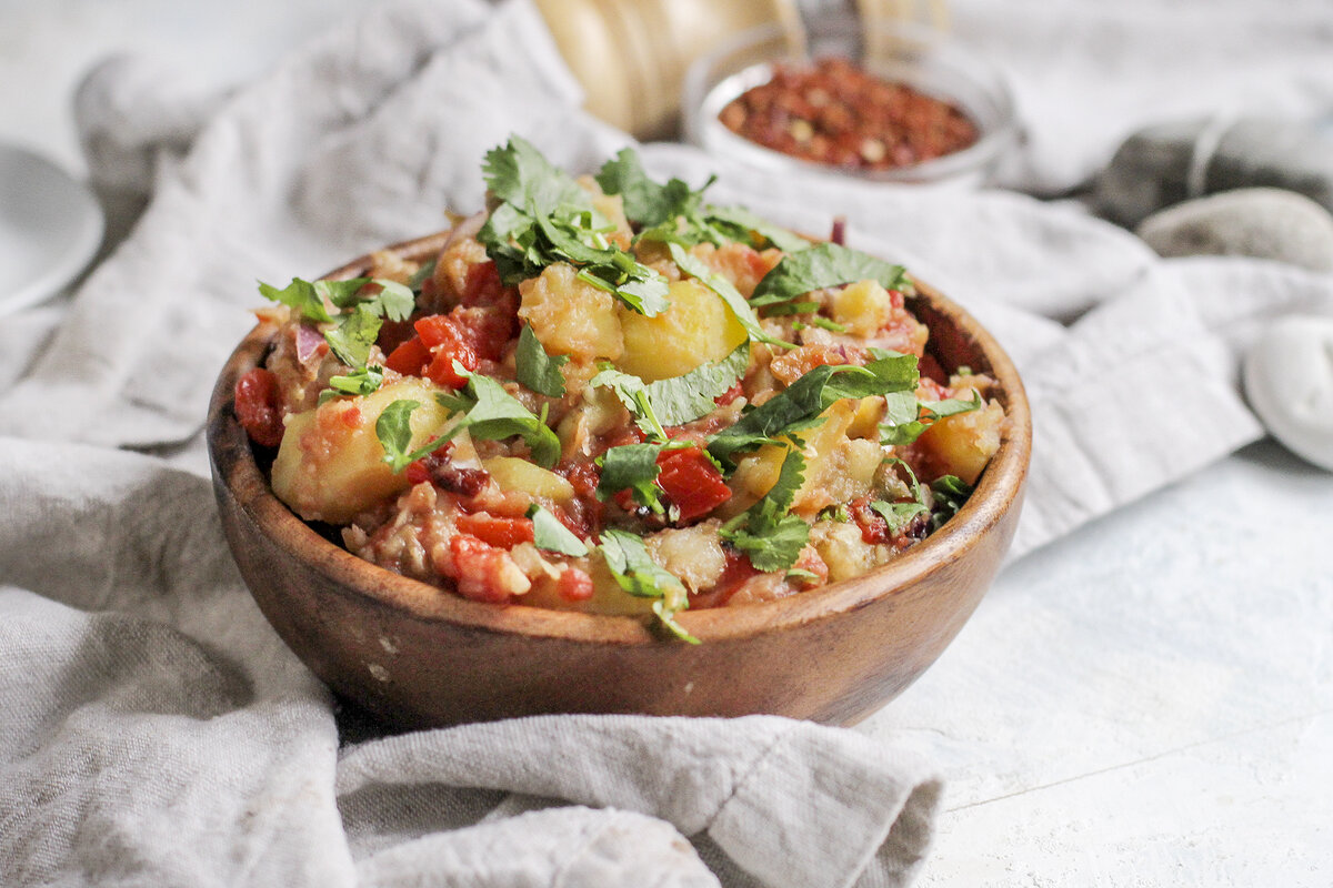 Запекать овощи следует примерно 25-30 минут до достижения мягкости. После этого дайте им немного остыть, очистите от шкурки и нарежьте крупными кусочками. Мелко нарежьте красный лук, чеснок и часть кинзы. Готовьте соус, смешав нарезанные помидоры с чесноком и хмели-сунели в сотейнике, доведите к кипению и прогрейте в течение 1-2 минут. Затем смешайте все запеченные овощи в глубокой миске, добавьте картофель и половину кинзы, залейте горячим соусом, посолите по вкусу и тщательно перемешайте.