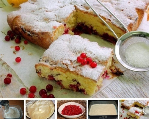 4. Смажьте форму для выпекания растительным маслом и немного присыпьте мукой. Выложите половину теста, равномерно разровняв его, а затем уложите красную смородину. Накройте оставшимся тестом, распределяя его поверх ягод.