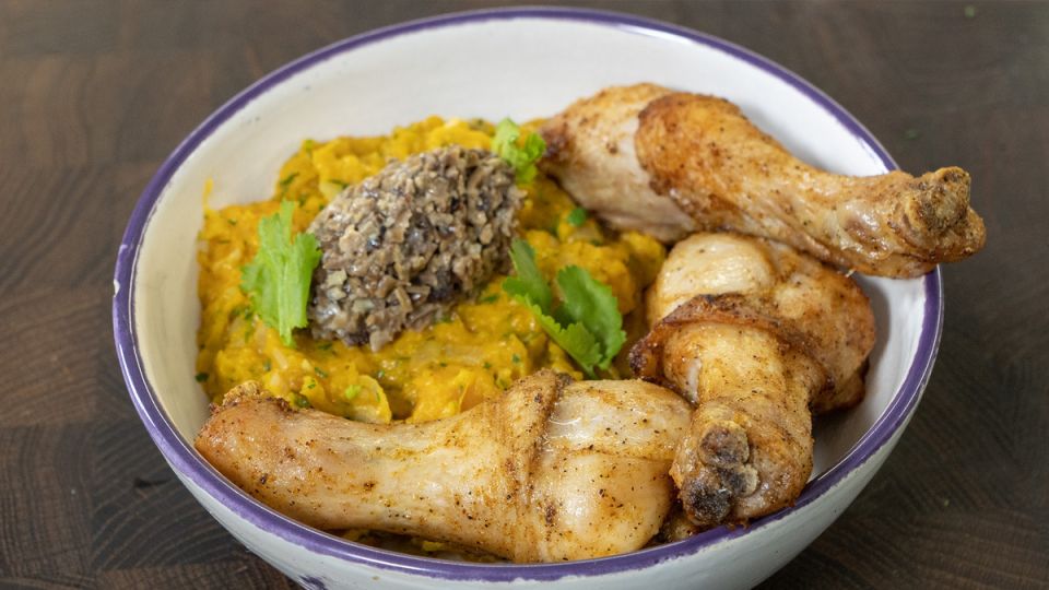 Далее, на сливочном масле обжарьте мелко нарезанный лук до золотистой корочки. Куриные голени предварительно приправляют сушеным чесноком, копченой паприкой и черным перцем, а затем обжариваются на растительном масле. После 10 минут обжаривания поместите голени в духовку, разогретую до 200 градусов, и оставьте запекаться на 20 минут.