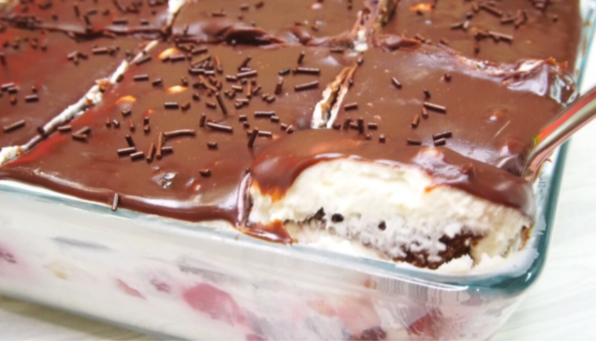 Пока сладость охлаждается, растопите шоколад на водяной бане и дайте ему немного остыть. Полейте им налитый десерт и оставьте его в холодильнике на ночь для поглощения всех вкусов, обеспечивая тем самым мягкость и нежность бисквита.