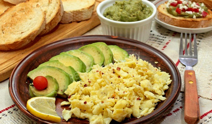 Приготовление: Взбейте яйца с приправами и растопите масло на сковороде. Влейте яйца и обжарьте, помешивая, в течение трех минут. Затем добавьте нарезанное авокадо и помидоры, готовьте еще одну минуту. Подавайте с тостами.