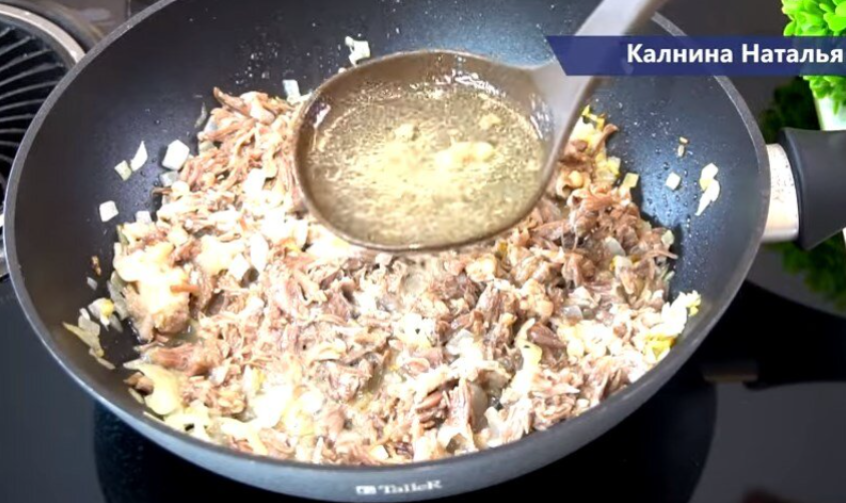 Для начала необходимо приготовить бульон из мяса. Оптимально использовать говядину на кости, варя её до готовности. После этого отделить мясо от костей, а лук нарезать кубиками. На сковороду налить растительное масло и обжарить лук до полупрозрачности. Затем добавить мясо, продолжая обжаривать еще несколько минут. Влить бульон и потушить все вместе около 5 минут.