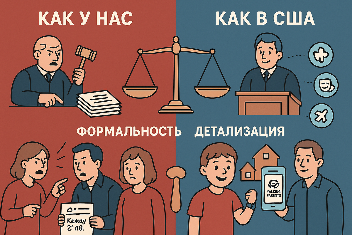 Что касается практики передачи детей между родителями, в США соблюдаются строгие правила. Передача часто осуществляется в заранее определенных местах и временных рамках, что исключает неразбериху. Также важно, чтобы оба родителя могли не только физически передавать детей, но и организовывать общение через современные мессенджеры и телефон.