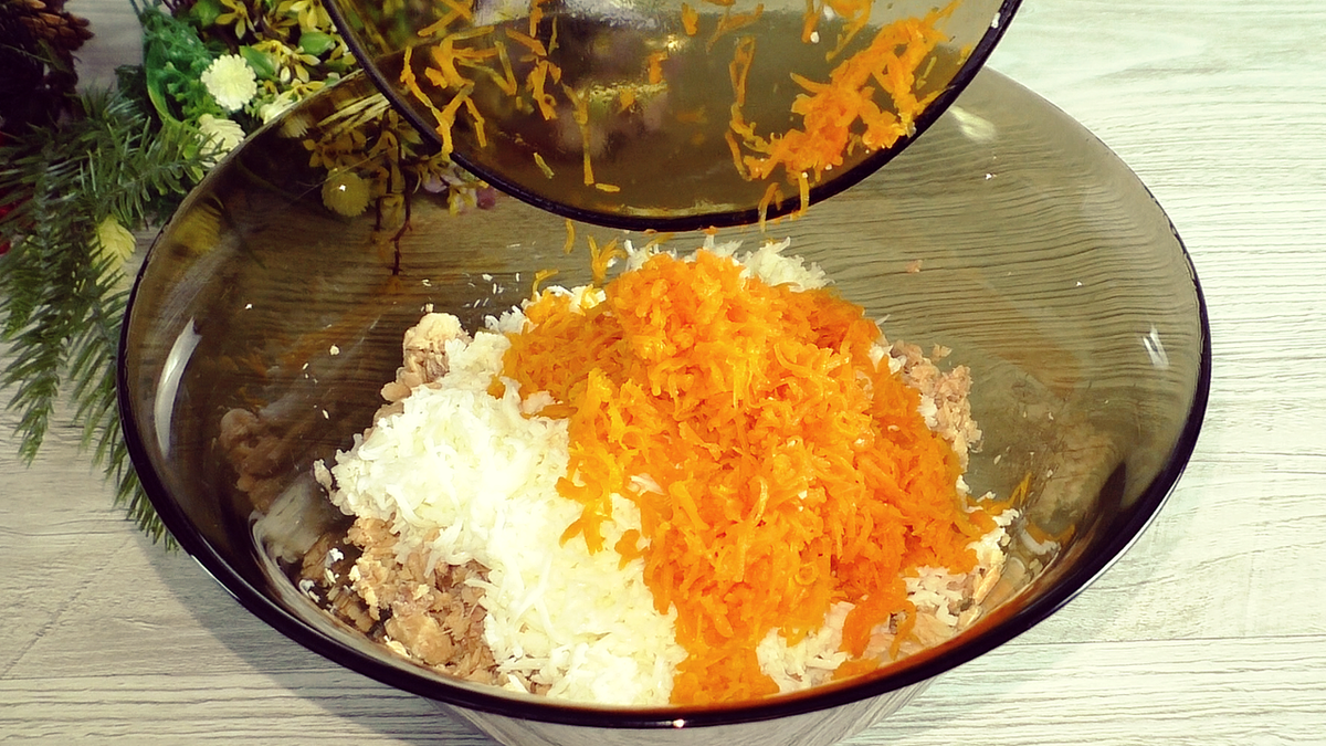 В отдельной миске смешиваются следующие ингредиенты: хорошо измельчённая рыба, белки, морковь и натёртый сыр. Зелёный лук нарезается и добавляется в салат (оставив немного для украшения). Время заправки — используйте майонез, но с добавлением соли будьте осторожны: это зависит от солёности ваших крекеров.