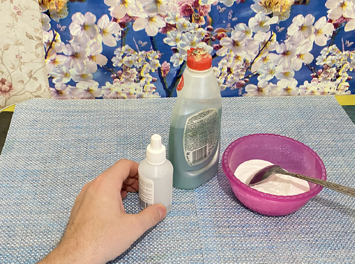 Эти компоненты известны своей чистящей способностью и найдутся на кухне каждой домохозяйки. Рекомендуется использовать соотношение: 4 столовые ложки соды, 1 столовую ложку перекиси и 1 столовую ложку мыла.